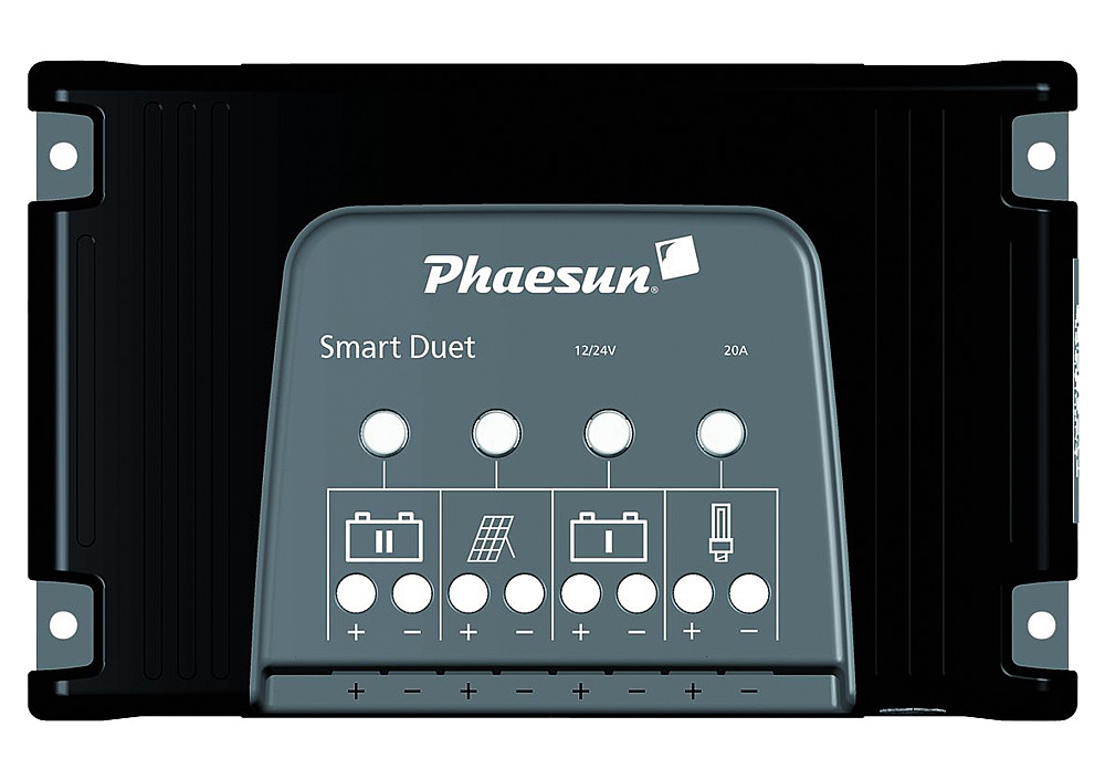 Solarladeregler mit 20 A Modulstrom, 20 A Laststrom, LED Anzeige und Ladegerät für 2 Batterien mit USB.